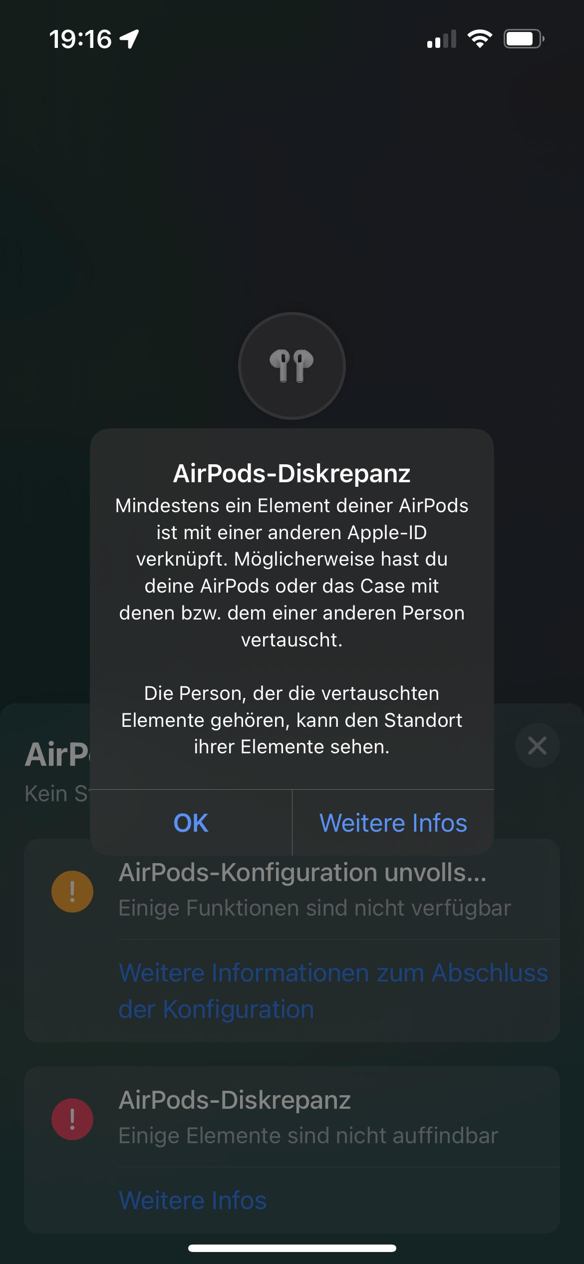 Und was wird stattdessen angezeigt? Werden die AirPods gar nicht erst in der WoIst App angezeigt oder werden sie angezeigt, aber nicht gefunden?