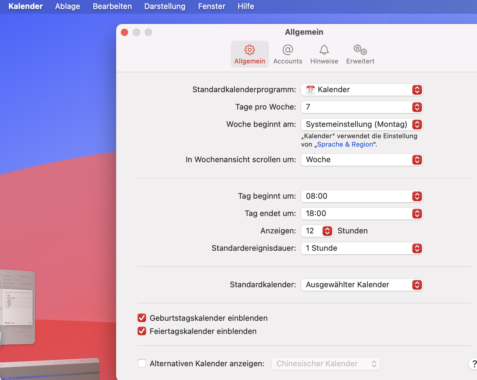 das stellst du nicht in den Einstellungen des Kalenders ein, sondern hast den Kalender ganz normal geöffnet. Gehst dann oben-links in der Leiste auf Darstellung und wählst Kalender anzeigen aus. Dann öffnet sich links von der Tages/Wochen/Monats/Jahr-Ansicht eine Liste deiner verschiedenen Kalender. In dieser Liste kannst du sie aktivieren und umbenennen. Über einen Rechtsklick auf den jeweiligen Kalender kann du diesen dann Löschen, Hinzufügen, Umbenennen.