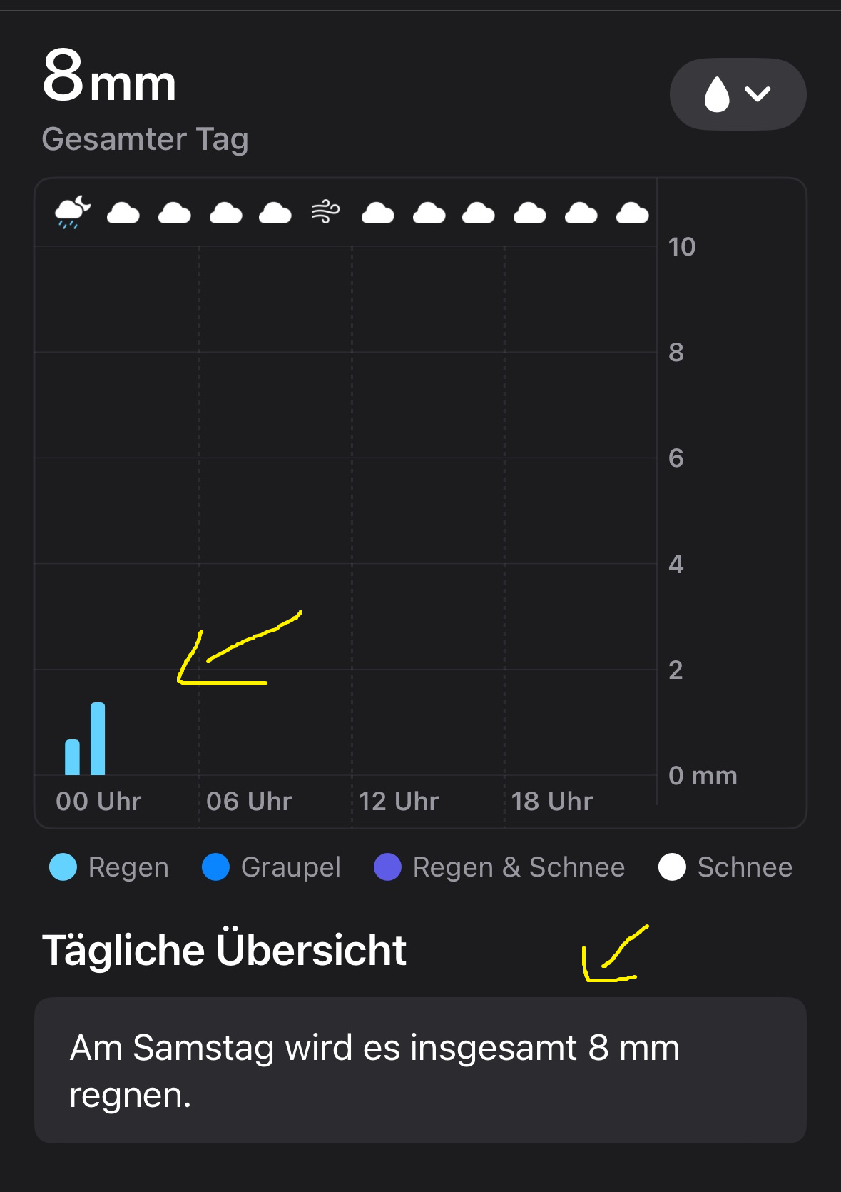 warum tut sich die Apple Wetter App in Deutschland mit der Vorhersage von Niederschlag so schwer? Jedes mal stehe ich im Regen und die Apple Wetter zeigt bwölkt mit 0% Niederschlagswahrscheinlichkeit. Zudem soll es in der Vorhersage für morgen 8mm regnen, in der Tagesübersicht mit den Balken komme ich vllt auf 2,5-3mm. Wie passt das zusammen?