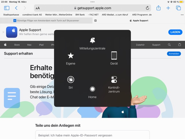 auf dem Display schwimmt ein schwarzes Viereck und auf dem die Mitteilungszentrale das Kontrollzentrum Home Siri angezeigt wird. Wie kann ich das verschwinden lassen?