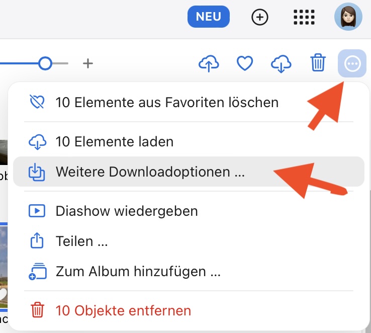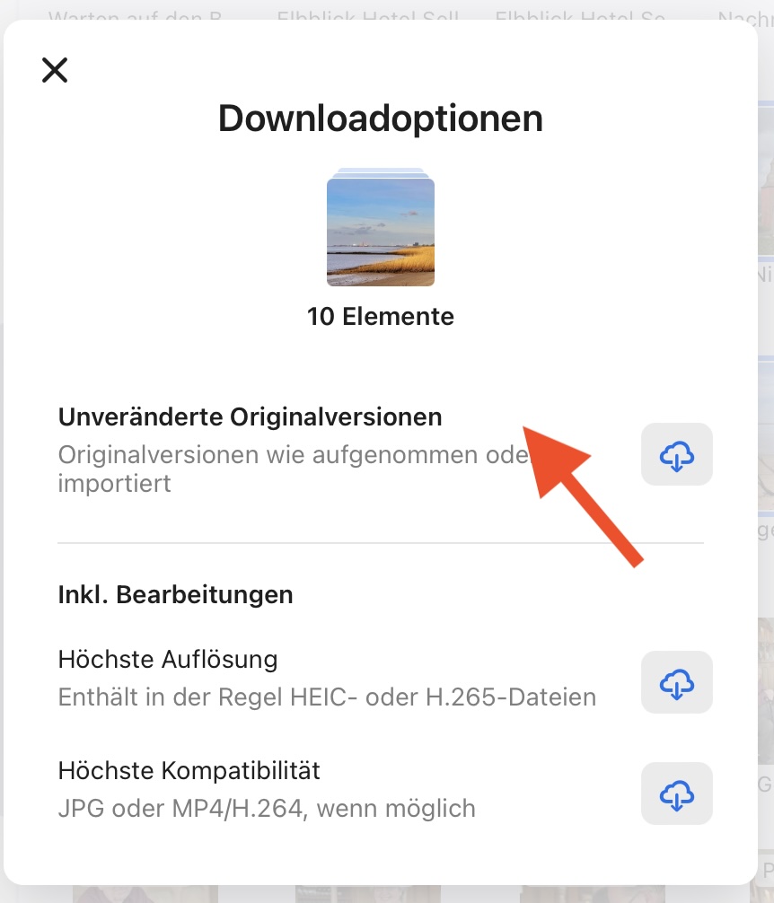 Um die Originale herunterzuladen, klicke auf das Menü mit dem Kreis mit den drei Punkten und wähle "Weitere Downloadoptionen". Dort wähle "Unveränderte Originale".