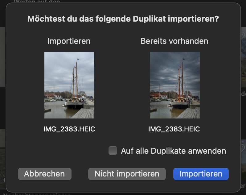 1. Wenn wir Fotos in Fotos importieren, wird nur nach exakten Duplikaten gesucht - es werden nur identische Bilddateien als Duplikat zurückgewiesen. Das Format muss stimmen - wenn wir beispielsweise bearbeitete Fotos aus Fotos exportieren und nicht das unbearbeitete Original exportieren, wird das Bild nicht als Duplikat erkannt, wenn wir es zurückimportierten. Selbst das unbearbeitete Original kann eventuell nicht als Duplikat erkannt werden, wenn sich beim Herunterladen aus iCloud Fotos das Erstellungsdatum geändert hat. Solange man aber nicht die Speicheroptimierung für iCloud Fotos verwendet, werden Duplikate der Originale aber in der Regel beim erneuten Importieren erkannt und wir bekommen eine Warnung: