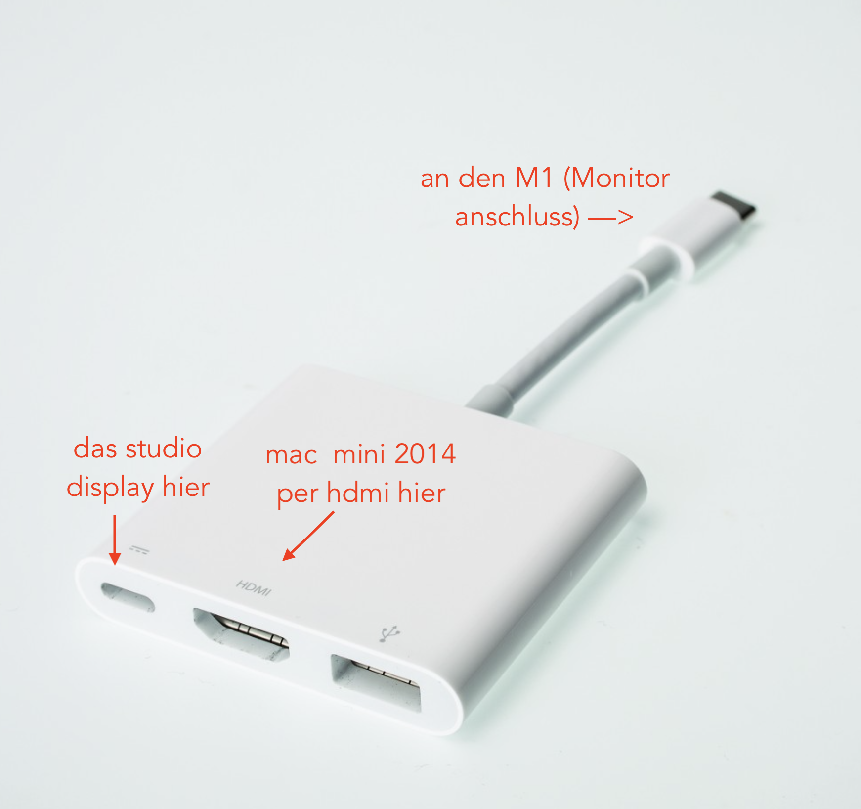 ja ich denke, dass ist die eine lösung lol. wäre eine verbindung vom 2014 mini per hdmi auf den USB‑C Digital AV Multiport Adapter und das studio display dann an den usb-c anschluss des adapters möglich? hmmm, ich denk jetzt wohl zu komliziert lol...