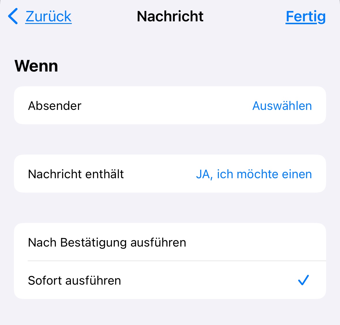 Sobald du diese Automatisierung erstellt hast, wird sie automatisch ausgeführt, wenn du eine Nachricht mit dem definierten Text von einem beliebigen Absender erhältst. Die App wird automatisch eine vorgefertigte Antwort senden und die empfangene Nachricht per E-Mail weiterleiten.