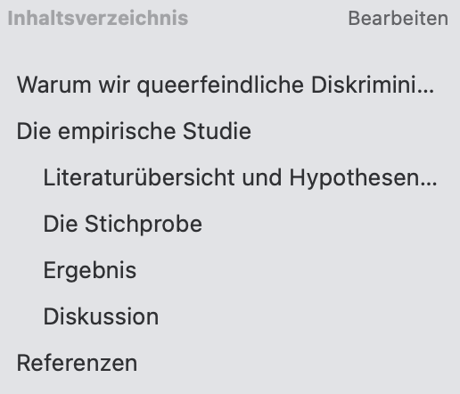 Ich arbeite mit einem automatisch erstellten Inhaltsverzeichnis, bei dem zwar alle Überschriften drin sind, die drin sein sollen - die von mir eingestellten Einzugsebenen für die jeweiligen Überschriften werden allerdings im Inhaltsverzeichnis nicht übernommen.