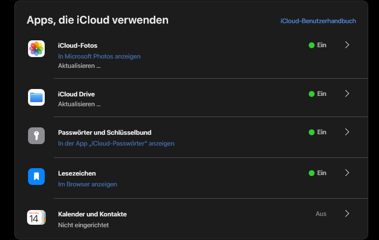 Nach dem anmelden wird in der Übersicht bei iCloud-Fotos und iCloud Drive ständig nur "Aktualisieren", bzw. "Initialisieren" angezeigt. Das war es dann auch. Es erscheinen weder Fotos im iCloud-Fotos Ordner weder Dateien im iCloud Drive Ordner. Ich habe bereits versucht die iCloud App neu zu installieren, was aber auch nichts änderte. Ab- und neu anmelden auch nicht. Wo kann hier der Fehler liegen? Vielen Dank schon mal. Grüße