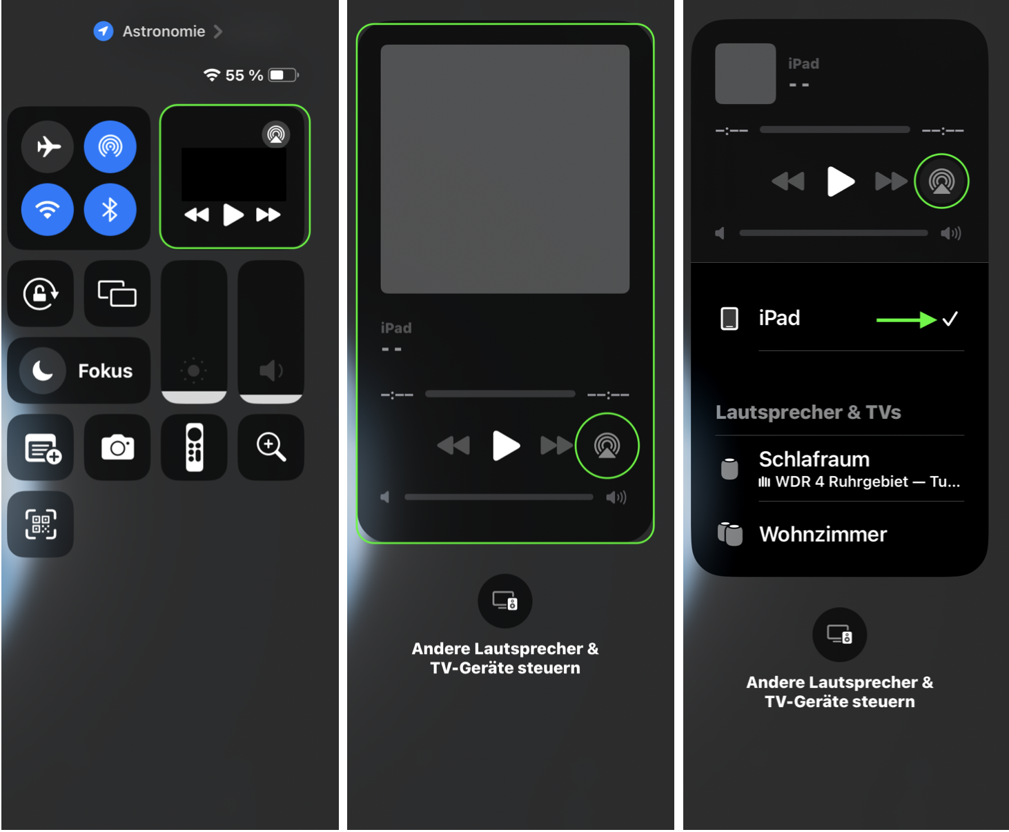 Hallo Hermannjo, öffne bitte das Kontrollzentrum und tippe rechts oben in das große Feld mit dem AirPlay-Symbol. In der nun angezeigten Darstellung kannst du z. B. sehen, ob hier dein iPad auf das Headset eingestellt wurde. Tippe auf das Symbol und wähle in der nun angezeigten Liste "iPad" aus. Danach solltest du den Ton über die Lautsprecher hören.