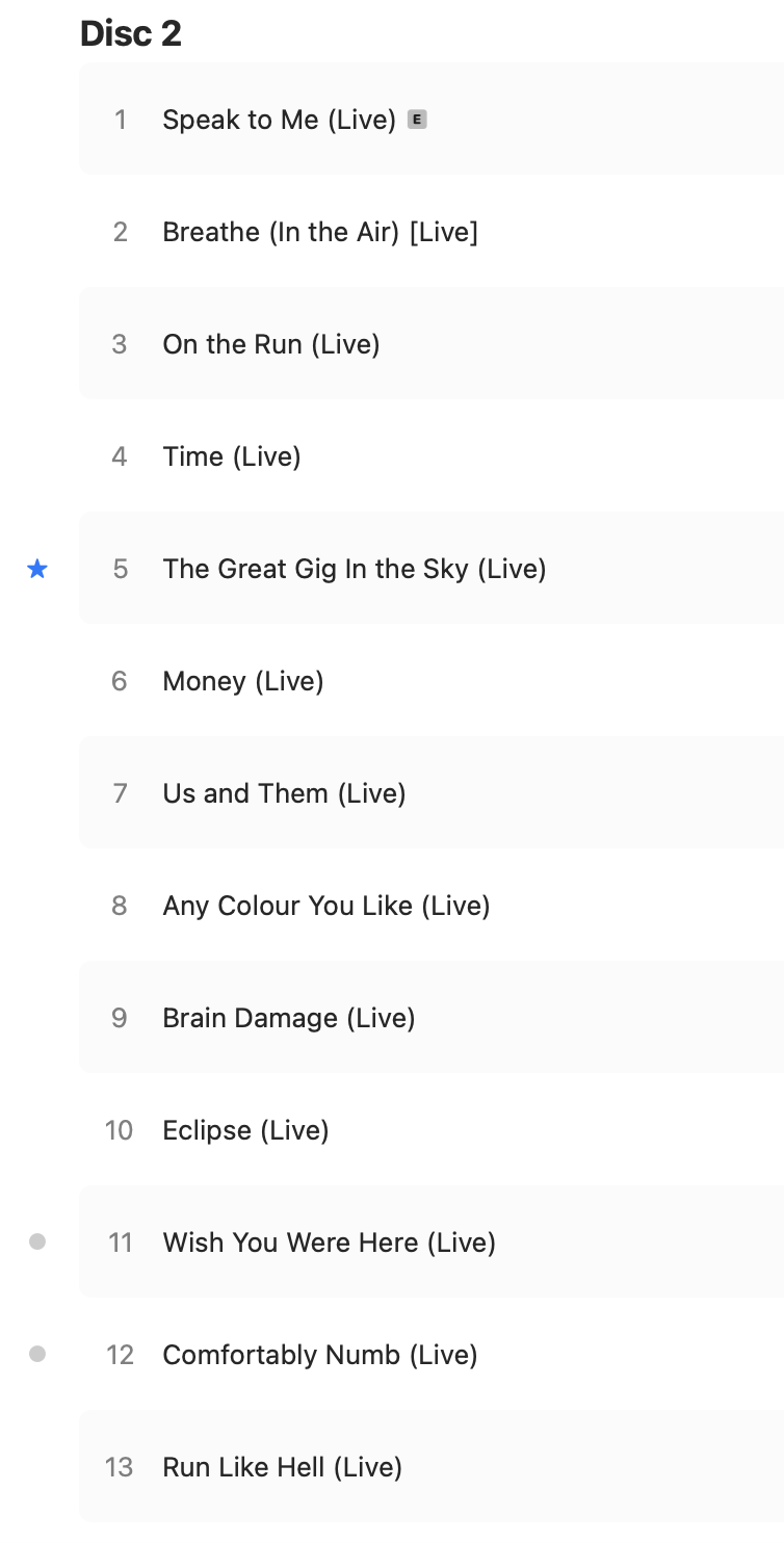 ich steigere gerade von Spotify zu Apple Music um und bin dabei über ein Detail gestolpert, dass ich trotz einiger Recherche nicht klären konnte. Auf allen Geräten (iOS, iPadOS, macOS) findet sich neben manchen(!) Titel ein grauer Punkt (siehe Screenshot von macOS). Genau dort, wo auch der Favoritenstern erscheint. Dabei scheint es sich um Titel zu handeln, die ich in der Vergangenheit schon mal gehört habe oder die aus sonstigen Gründen als Favoriten in Frage kommen.