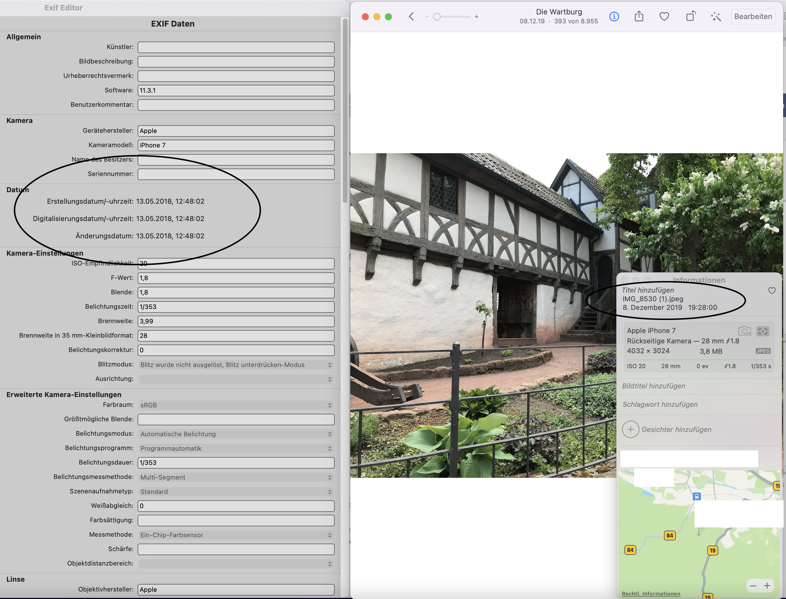 Nun habe ich bei einigen Fotos in der Informationsbox ein Datum stehen, das ich im EXIF-Editor überhaupt nicht finde. Das dies bei meinem Vorgehen passieren kann, habe ich verstanden.