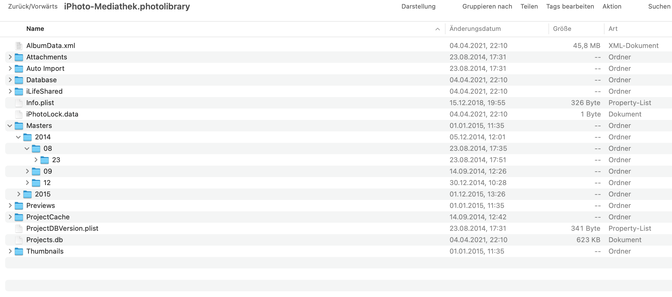 Wenn diese iPhoto Mediathek eine Mediathek ist, die du mit Fotos geöffnet hast, um daraus deine erste Fotosmediathek zu machen, dann belegt allerdings sie nicht viel zusätzlichen Speicher. Fotos und iPhoto teilen sich die Bilder, die in beiden Mediatheken identisch sind. Wenn Fotos eine iPhoto Mediathek in eine Fotos Mediathek wandelt, werden in der neuen Fotosmediathek Kopien der Fotos in der iPhoto Mediathek angelegt. Diese Kopien benötigen keinen zusätzlichen Speicher, da sie Hard links sind. Sie liegen auf denselben Blöcken des Laufwerks wie die Originale. Die Bilder in der alten iPhoto Mediathek und der neuen Fotos Mediathek liegen sozusagen Huckepack am selben Ort auf dem Laufwerk, sie sehen aber für den Finder wie unabhängige Kopien aus und der Speicherbedarf für die alte iPhoto Mediathek wird als so berechnet, als wären die Hard Link Dateien nicht gelinkt. Wir können aber unbesorgt die iPhoto Mediatheken auf ein anderes Laufwerk verschieben. Das wird etwas Speicher sparen, aber nicht viel. Du wirst den Speicher für die Bilder einsparen, die du schon in Fotos gelöscht hast, aber noch nicht in iPhoto.