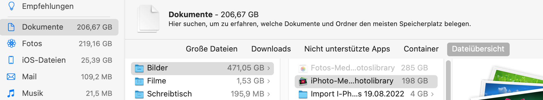Unter Dokumente werden auch zusätzlich deine System Mediatheken angezeigt, die Fotos Mediatheken, oder Musik Mediathek. Die Mediathek umfasst ja zusätzliche Daten, die nicht unter Fotos oder Musik oder Videos fallen.