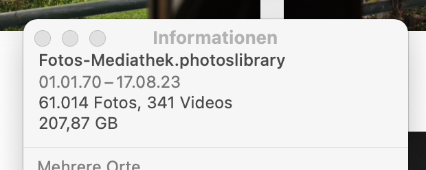 Bei einigen älteren Systemversionen war die Anzeige der Grösse der Fotosmediathek im Finder nicht sehr zuverlässig. Das liegt daran, dass die Fotosmediathek ein Paket ist, das viele Unterordner enthält und wir sehen im Finder dieses Paket nur als Einheit. Bei den älteren Systemversionen hat der Finder aber nicht regelmässig die Größte neu berechnet, wenn sich im Innern etwas geändert hat. Du kannst sehen, wie gross die Mediathek wirklich ist, wenn du das Paket öffnest und auf die Unterordner schaust. Aber sei sehr vorsichtig, wenn du das tust.. Verändere ja nichts, sondern schaue nur auf die Grösse der Unterordner.