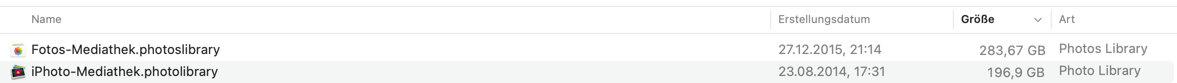 Wenn diese iPhoto Mediathek eine Mediathek ist, die du mit Fotos geöffnet hast, um daraus deine erste Fotosmediathek zu machen, dann belegt allerdings sie nicht viel zusätzlichen Speicher. Fotos und iPhoto teilen sich die Bilder, die in beiden Mediatheken identisch sind. Wenn Fotos eine iPhoto Mediathek in eine Fotos Mediathek wandelt, werden in der neuen Fotosmediathek Kopien der Fotos in der iPhoto Mediathek angelegt. Diese Kopien benötigen keinen zusätzlichen Speicher, da sie Hard links sind. Sie liegen auf denselben Blöcken des Laufwerks wie die Originale. Die Bilder in der alten iPhoto Mediathek und der neuen Fotos Mediathek liegen sozusagen Huckepack am selben Ort auf dem Laufwerk, sie sehen aber für den Finder wie unabhängige Kopien aus und der Speicherbedarf für die alte iPhoto Mediathek wird als so berechnet, als wären die Hard Link Dateien nicht gelinkt. Wir können aber unbesorgt die iPhoto Mediatheken auf ein anderes Laufwerk verschieben. Das wird etwas Speicher sparen, aber nicht viel. Du wirst den Speicher für die Bilder einsparen, die du schon in Fotos gelöscht hast, aber noch nicht in iPhoto.