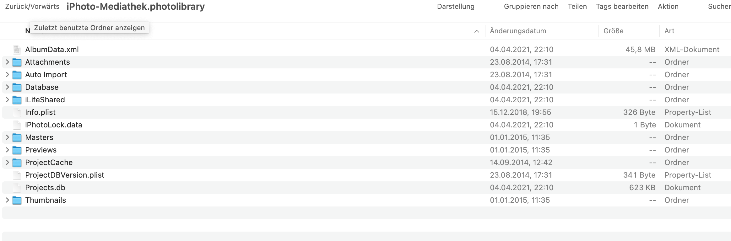 Für meine iCloud Fotos Mediathek wird als Größe in Fotos selbst 270GB angezeigt. Im Finder, im Ordner Bilder, sehe ich aber 376,58GB, deutlich mehr. Die Differenz entspricht der Größe der zusätzlichen Ordner in der Mediathek mit den Vorschauen, z.B. resources.