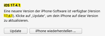 Hallo, seit ich mein iPhone 14pro Max auf die iOS-Version 17.4.1 upgedatet hab, will iTunes (Version 12.13.1.3) dennoch jedes Mal, wenn ich das iPhone verbinde, mit iOS 17.4.1 updaten. Was natürlich nicht geht.