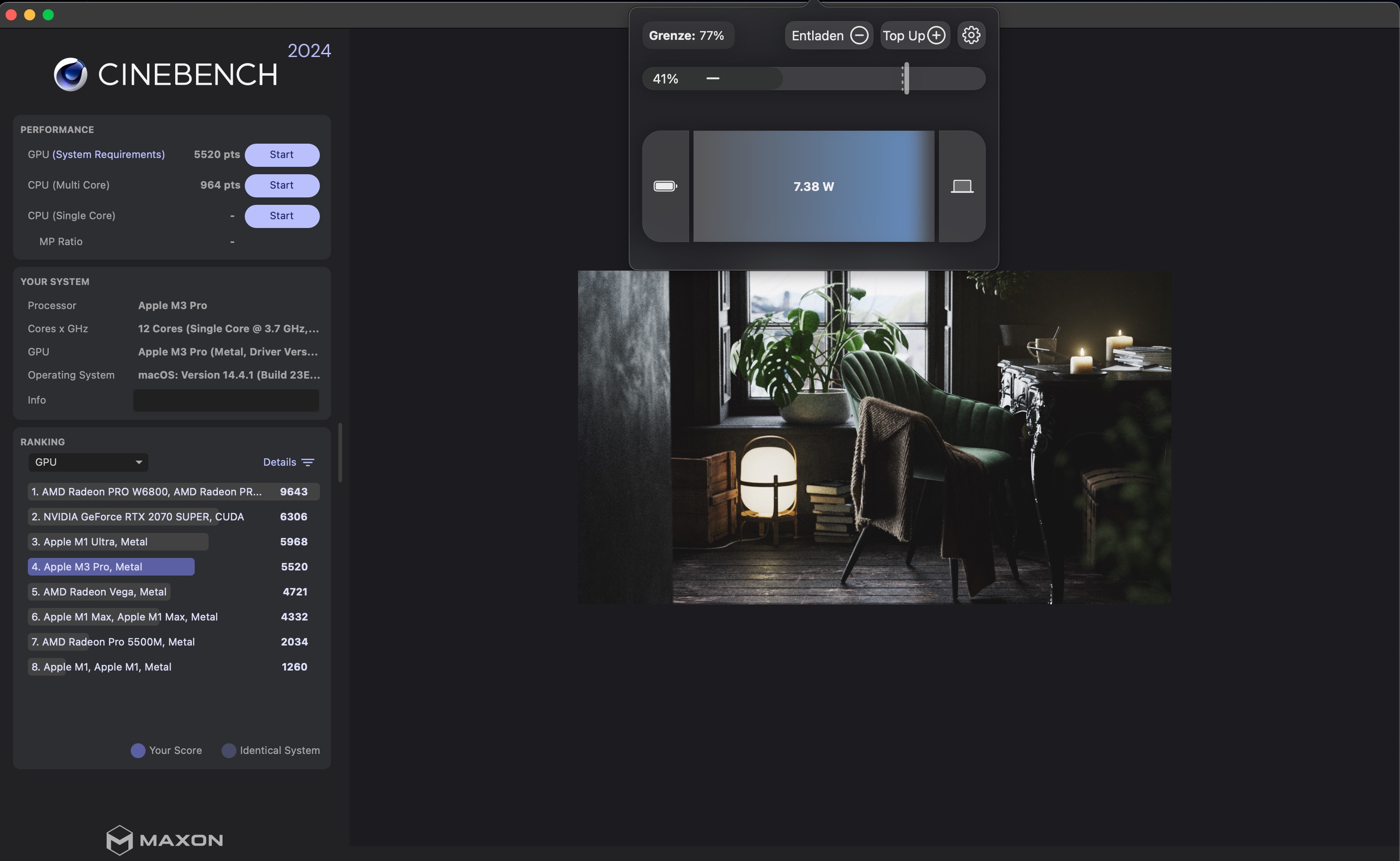 Nun habe ich das 15er Air M3 und dort ändert sich praktisch nichts, wenn ich den Energiesparmodus aktiviere. Bei Cinebench 2024 steigt die Leistungsaufnahme auf über 30 Watt (Gesamtes System)