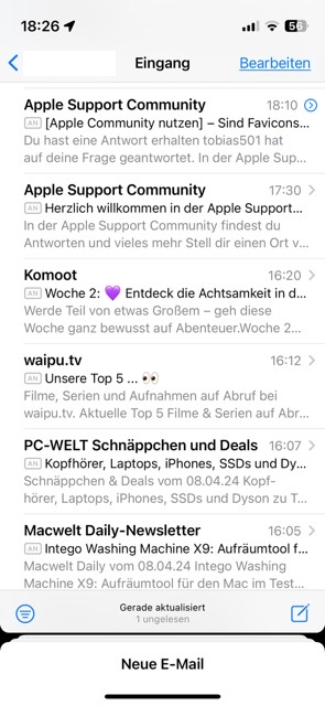 Hier die Ansichten der eingegangenen Mail auf dem iPhone über das Programm Spark (mit den Favicons) und über Apple Mail, hier werden in der Auflistung keine Favicon angezeigt. Nur beim öffnen der einzelnen Mail zeigt Apple Mail die Anfangsbuchstaben des Absenders an, aber nicht die die Grafiken.