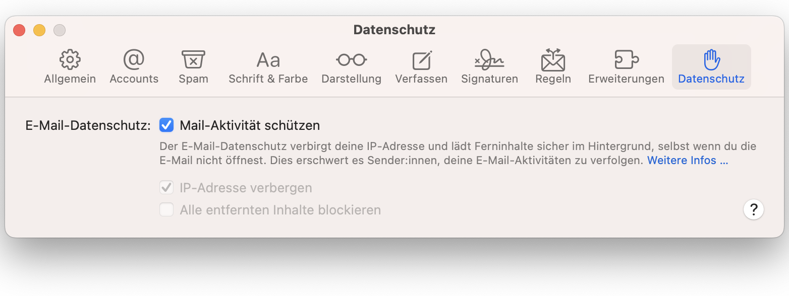 entschuldige bitte, falls meine vorherige Erklärung nicht deutlich war. Ich habe bewusst alle Bilder in Apple Mail blockiert, inklusive Favicons, um zu verhindern, dass Absender Informationen über mein E-Mail-Verhalten sammeln. Dies schützt vor dem unbemerkten Sammeln von Daten wie Öffnungszeiten der E-Mails, IP-Adresse und weiteren Informationen, die mein Nutzerverhalten profilieren könnten.