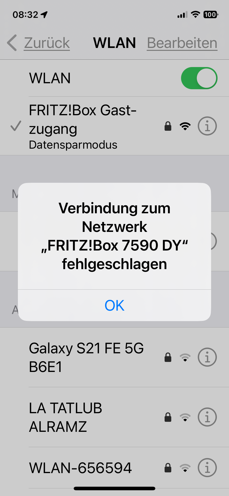 Es gibt wird zwar ein WLAN-Netzwerk angezeigt, es ist aber nicht mehr möglich, mit einem mobilen Gerät (iPhone, iPad) auf das Internet zuzugreifen.