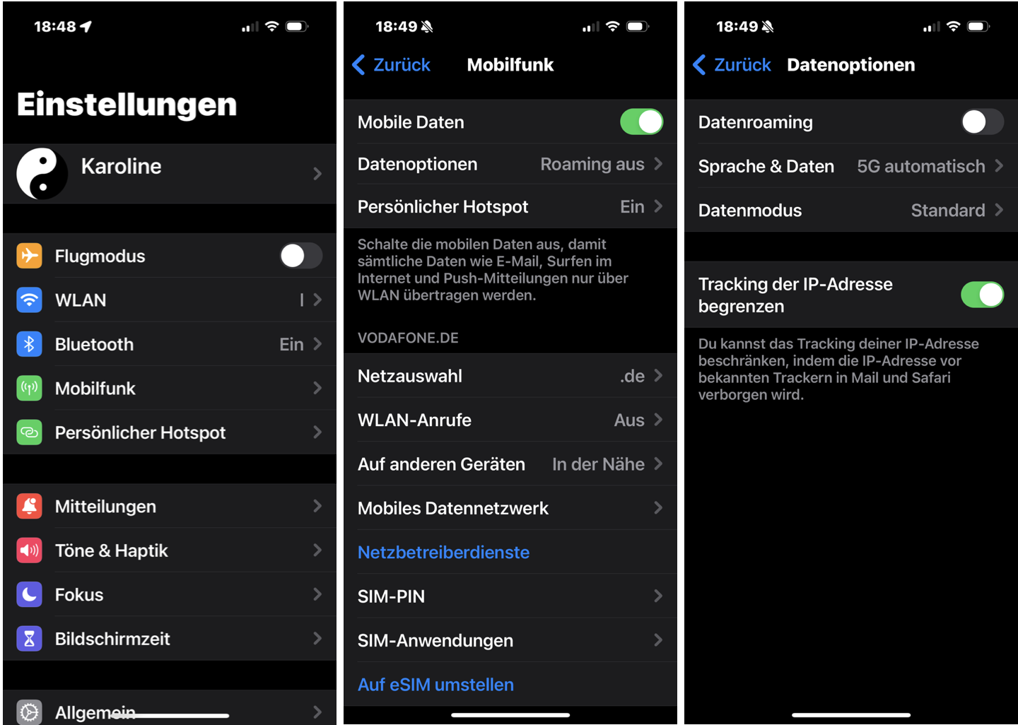 Zu c.) Hier gibt es die Möglichkeit, eine physische SIM gegen die aktuelle auszuwechseln oder eine E-Sim zusätzlich zu aktivieren. (Ich nutze ein iPhone 12 mini).