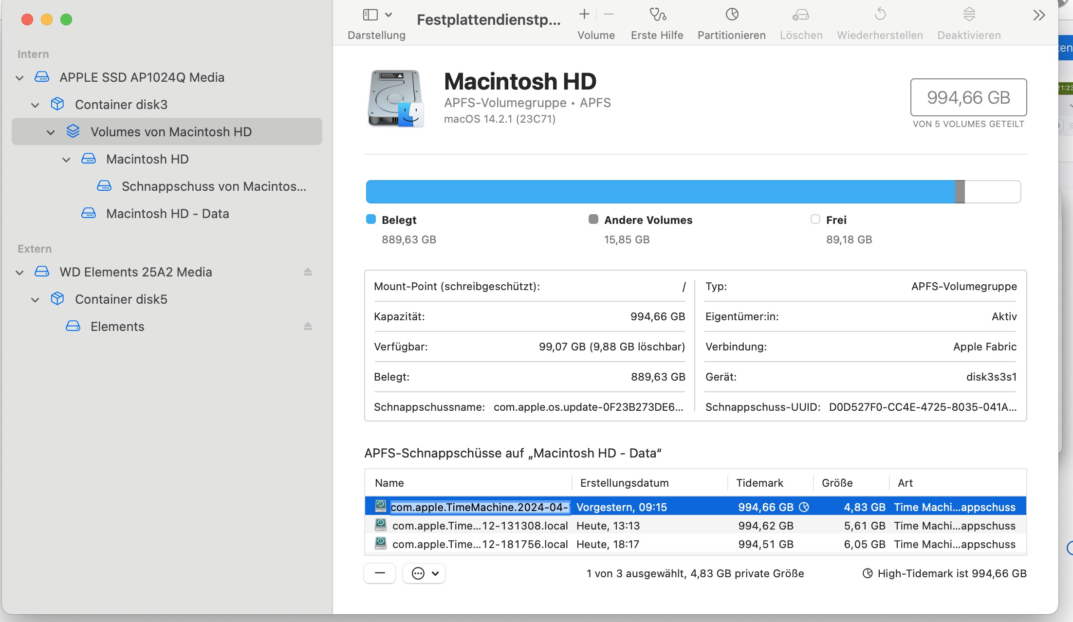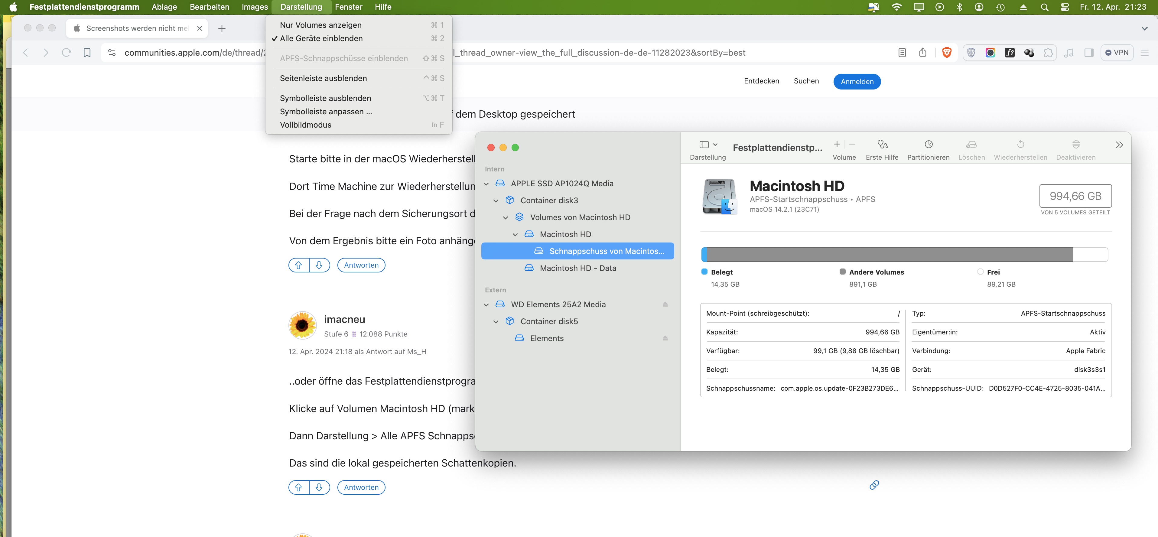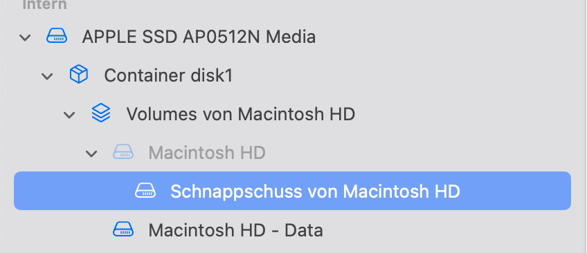 Dann habe ich, weil ich eine Vorahnung hatte, im Festplattendienstprogramm nachgeschaut und sehe diese neu angelegte Schnappschuss HD, die sehr warhscheinlich das Programm angelegt hat.