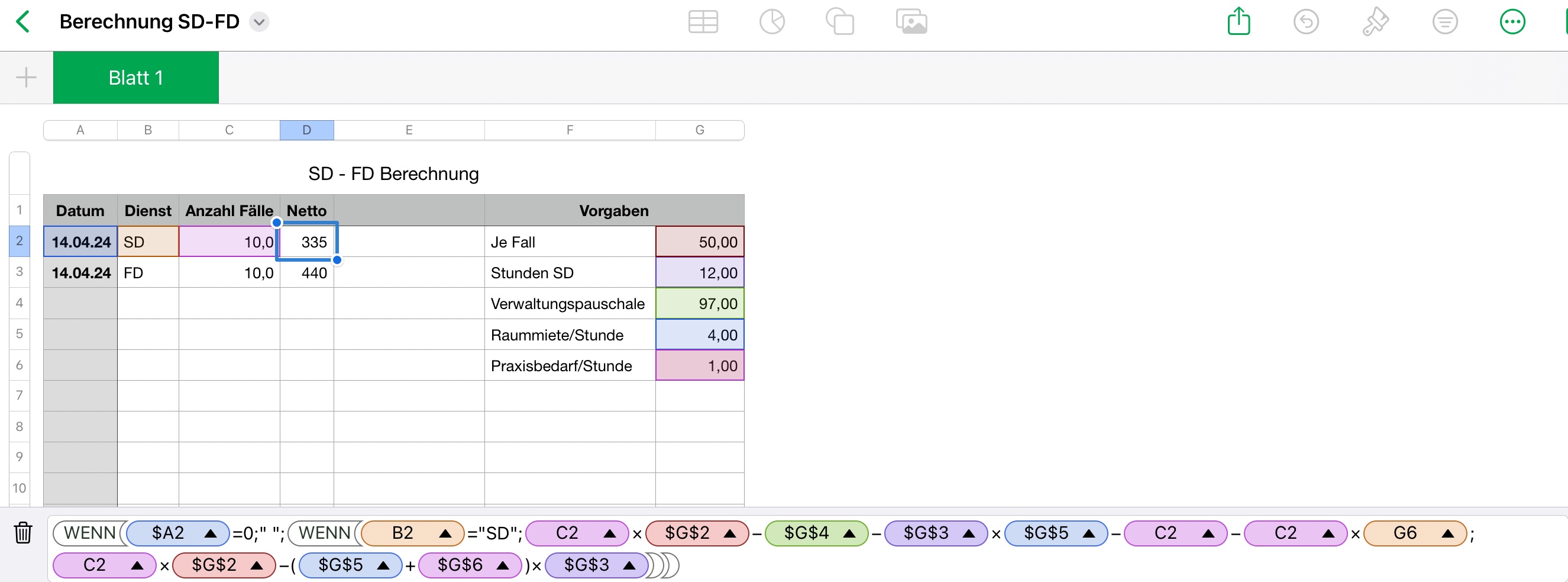 Hilfreich dazu ist eine „Zettelrechnung“,in der du dir aufschreibst, welche detaillierten (keine Kopfrechnungen als Zwischenergebnisse) Rechenschritte dein Nettoeinkommen pro Dienstart ergeben. Genauso entsteht die Formel. Die konkreten Zahlen entnimmst du dann den Vorgabewerten.