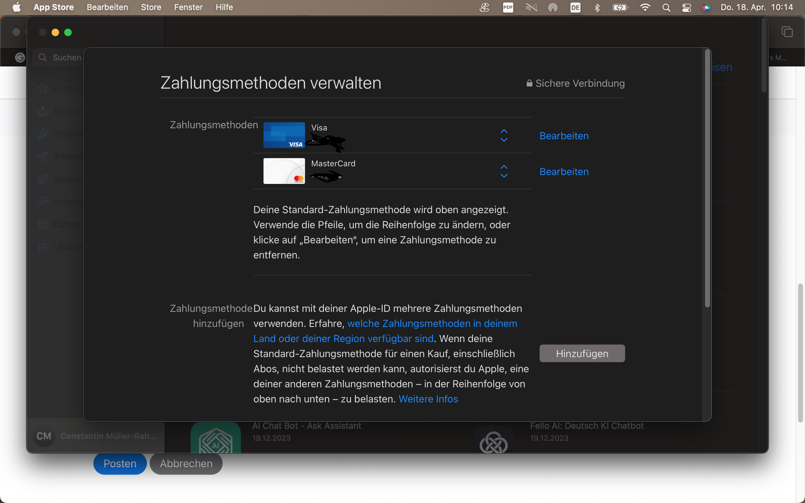 Apple nutzt die hinterlegten Zahlungsmethoden für Abbuchungen in der Reihenfolge, wie sie in deinem Account angezeigt werden, von oben nach unten.