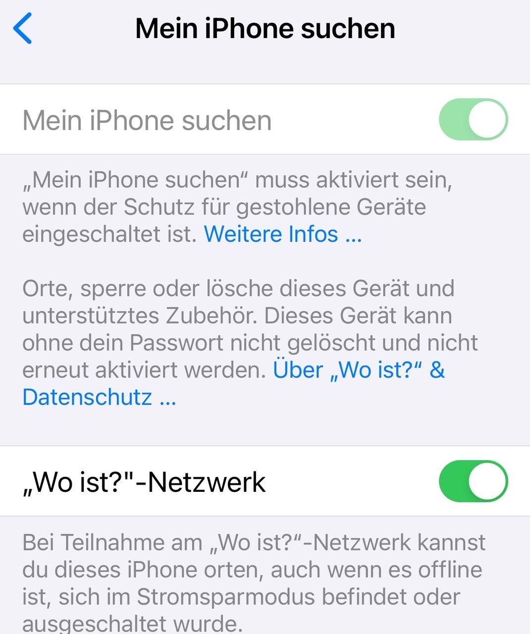 ei iCloud wird der Standort meines iPhone nicht angezeigt (im Web). "Wo ist mein iPhone" ist aktiviert. Komischerweise habe ich bei der Gelegenheit entdeckt, dass ich auf dem iPhone "mein iPhone suchen" NICHT deaktivieren kann. Der Button erscheint blass grün und nicht normal grün. (siehe Bild).Irgendeine Idee? Softwareupdate ist vollzogen, Neustart auch