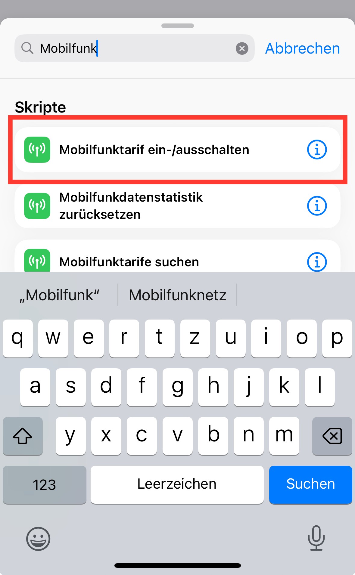 Tippe auf weiter und im nächsten Fenster auf "Neue leere Automation". Tippe auf "Aktion hinzufügen", gebe im Suchfeld "Mobilfunk" ein und wähle die Aktion "Mobilfunktarif ein-/ausschalten" aus.