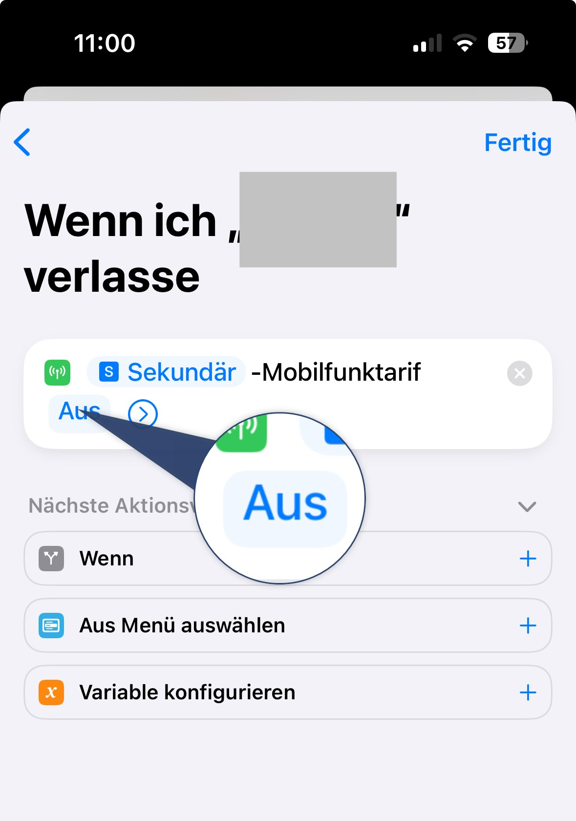 Tippe "Mobilfunktarif" an um eine Variable zu setzen. Wähle im Kontextmenü deinen Mobilfunktarif mit deiner geschäftlichen / sekundären Rufnummer aus. Tippe dann auf "Fertig".