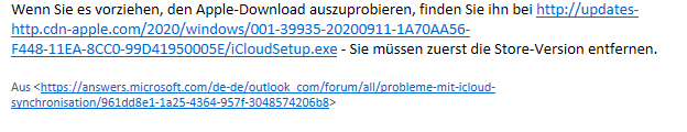 Ich hab in allen möglichen Foren nachgelesen, aber keine brauchbare Hilfe gefunden. Ich hab sowohl Windows als auch MS-Office und auch iCloud mehrmals neu installiert - keine Änderung. Ich war ratlos.