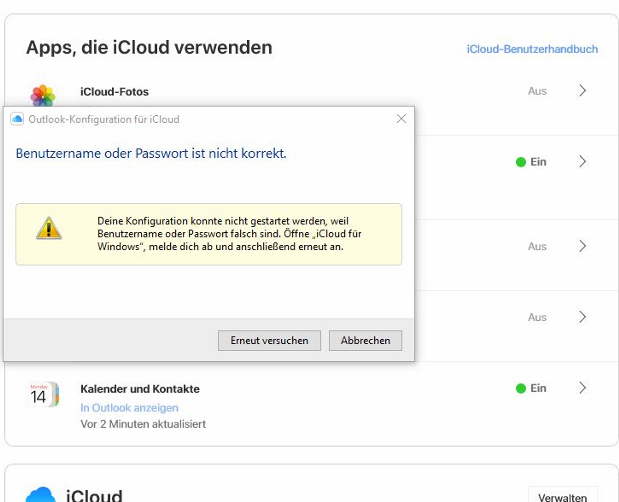 Ich musste meinen Windows PC neu aufsetzen (Windwos 10) und dabei auch das MS-Office-Paket neu installieren. Natürlich wollte ich meinen Outlook Kalender und die Kontakte wieder mit meinen Mobilgeräten synchronisieren. Nach der Installation und der Installation von iCloud aus dem Microsoft Store bekam ich allerdings immer folgende Fehlermeldung: