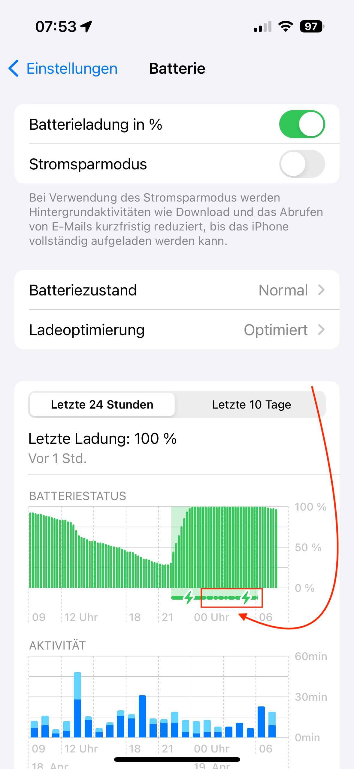 leider habe ich bislang nichts zu meinem Problem gefunden: Seit einiger Zeit (ich habe das mal mit den letzten Updates von iOS verglichen - ich schätze daher seit dem Update auf 17.4) laden unsere iPhones 15 Pro nachts per MagSafe nicht mehr durchgängig, sondern der Ladevorgang wird mehrfach unterbrochen. Optimiertes Laden ist grundsätzlich aktiviert, ist jedoch nicht der Grund, da der Ladevorgang vollständig unterbrochen wird - man hört insbesondere das "Pling", so wie wenn das iPhone auf das MagSafe-Ladegerät gelegt wird (das optimierte Laden funktioniert aber dadurch leider auch nicht mehr, da das iPhone ja keine "Gewohnheit" der üblichen Nutzungszeit mehr erkennt).