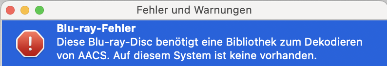 Die via HomeBrew installierte libaacs.0.dylib wurde umbenannt in /usr/local/lib/ kopiert. Danach funktioniert das Abspielen von Blu-ray's mittels VLC auf einem Mac mit Apple M1.