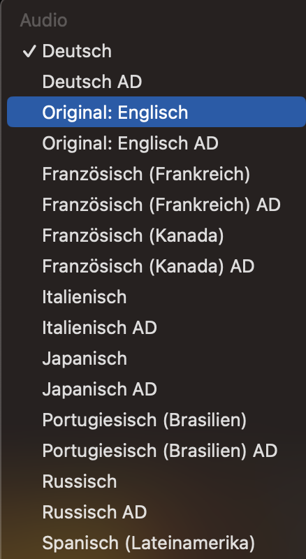 Hallo, ich habe heute einen Film über die Apple TV app gekauft. Er ist leider nur auf Deutsch. Die Originalsprache ist aber Englisch also denke ich dass man das irgendwie einstellen müsste? Wie geht das? Ich habe nachträglich auch meine Audiosprache in den Einstellungen geändert aber der Film bleibt weiterhin nur Deutsch..