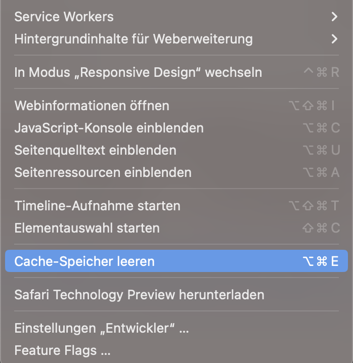 III. gehe zum Safari-Menue „Entwickler" -> „Cache-Speicher leeren"