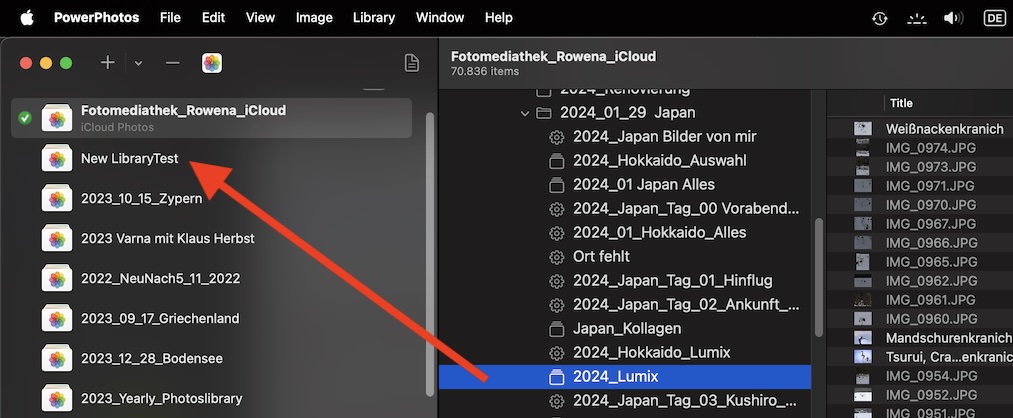 Einfacher wäre es mit PowerPhotos, falls du dir dieses Programm gekauft hast. In PowerPhotos können wir mehrere Fotomediatheken gleichzeitig verwalten, indem wir sie der Seitenleiste hinzufügen. Dann kann ich einfach eine Fotomediathek öffnen, das gewünschte Albumoder einen Ordner mit Alben auswählen und auf die Miniatur einer anderen Mediathek ziehen, um die ausgewählten Alben mit den Fotos einer anderen Mediathek hinzuzufügen.