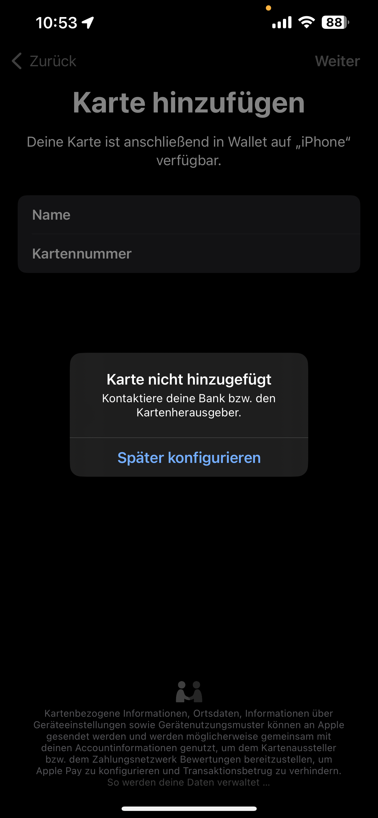 Karte kann nicht zu Apple Pay (Wallet) hinzugefügt werden