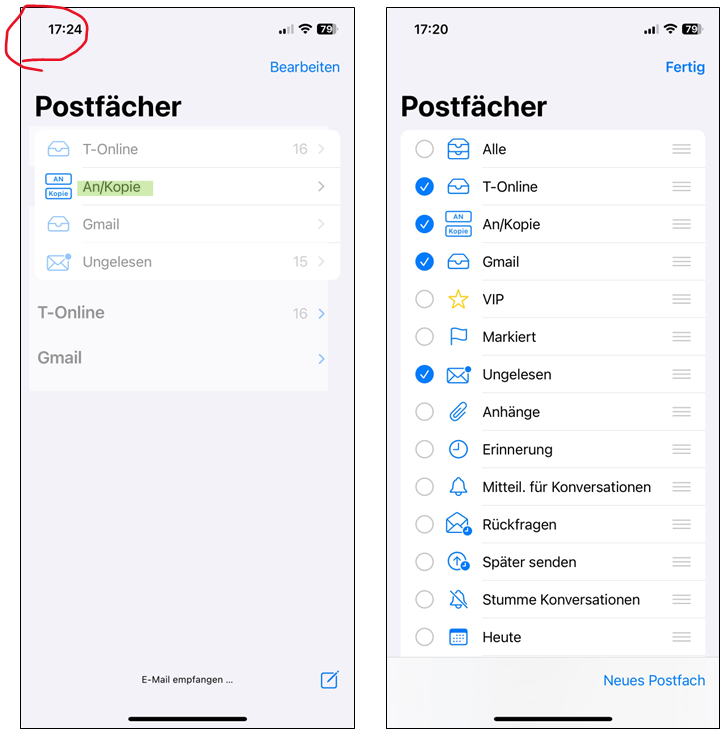 Hallo. Ich habe in Mail im „Postach“ An/Kopie irgendwie meine e-Mail Adresse eingegeben. so bekomme ich die Mails herausgefiltert. Leider werden aber Mails, in denen ich nicht der alleinige Adressat bin nicht angezeigt.