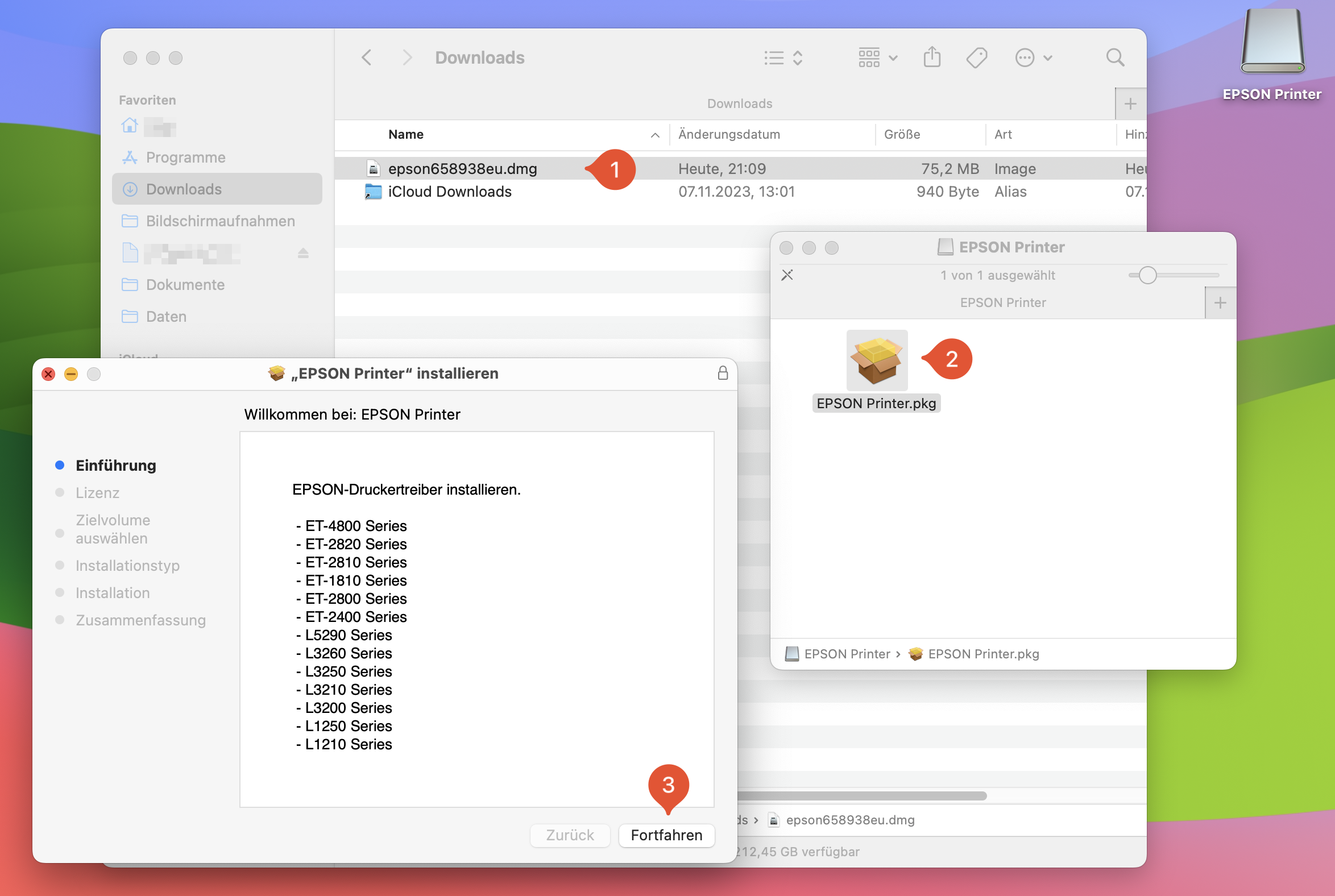derzeit versuche ich einen Epson ET-2812 Drucker auf meinem Mac zu installieren. ich habe schon mehrmals versucht, die Treiber-Software vom Hersteller downzuloaden, kann sie dann bei der Druckeranmeldung (bei den Einstellungen "Drucker und Scanner" nicht aus dem Download-Bereich als Treiber abrufen und dem Drucker auf dem Rechner zuordnen. Was mache ich falsch?