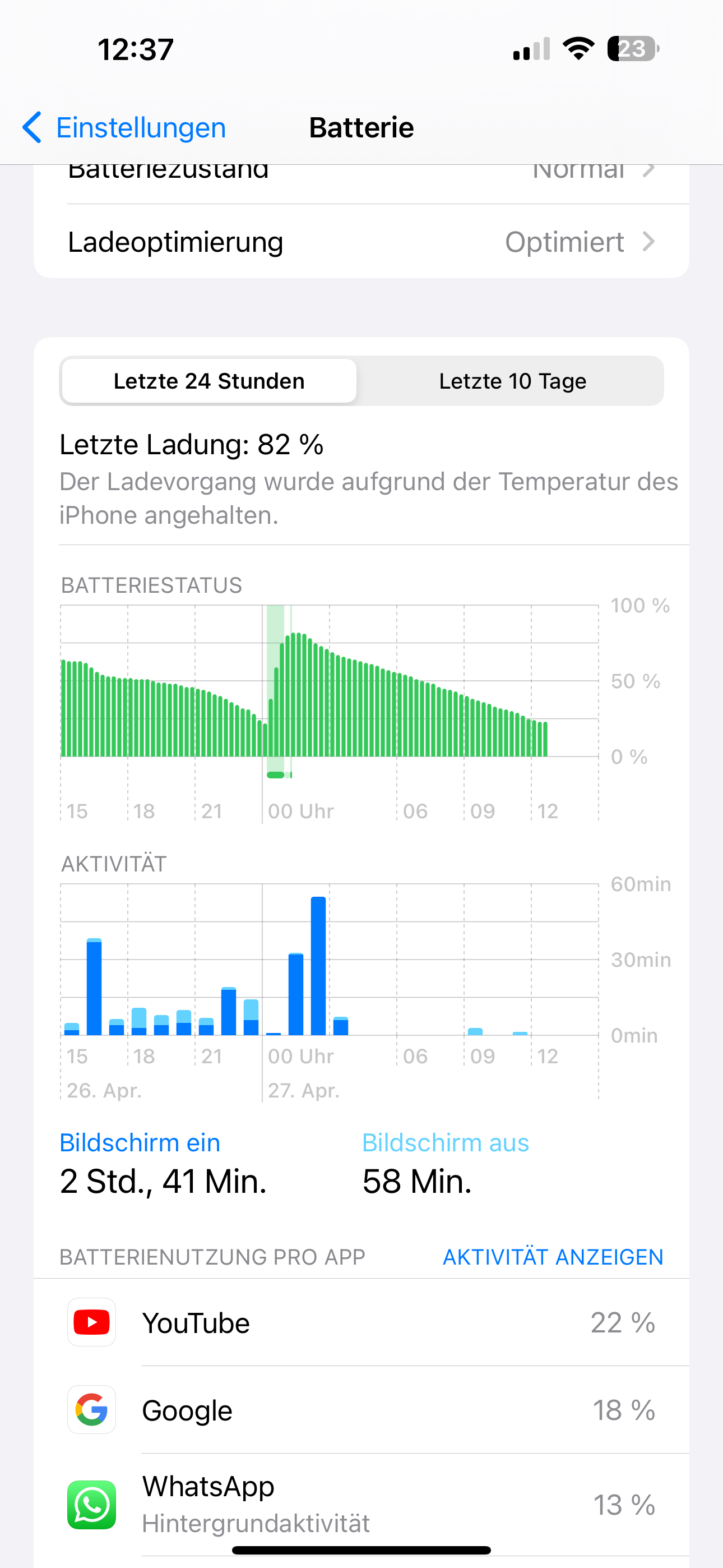Dann wurde mir empfohlen Instagram zu deinstallieren, da die App einen hohen Akkuverbrauch aufweist. Hab ich gemacht und dann die Akkunutzung meines iPhones 3 Tage überwacht. Keine Besserung.