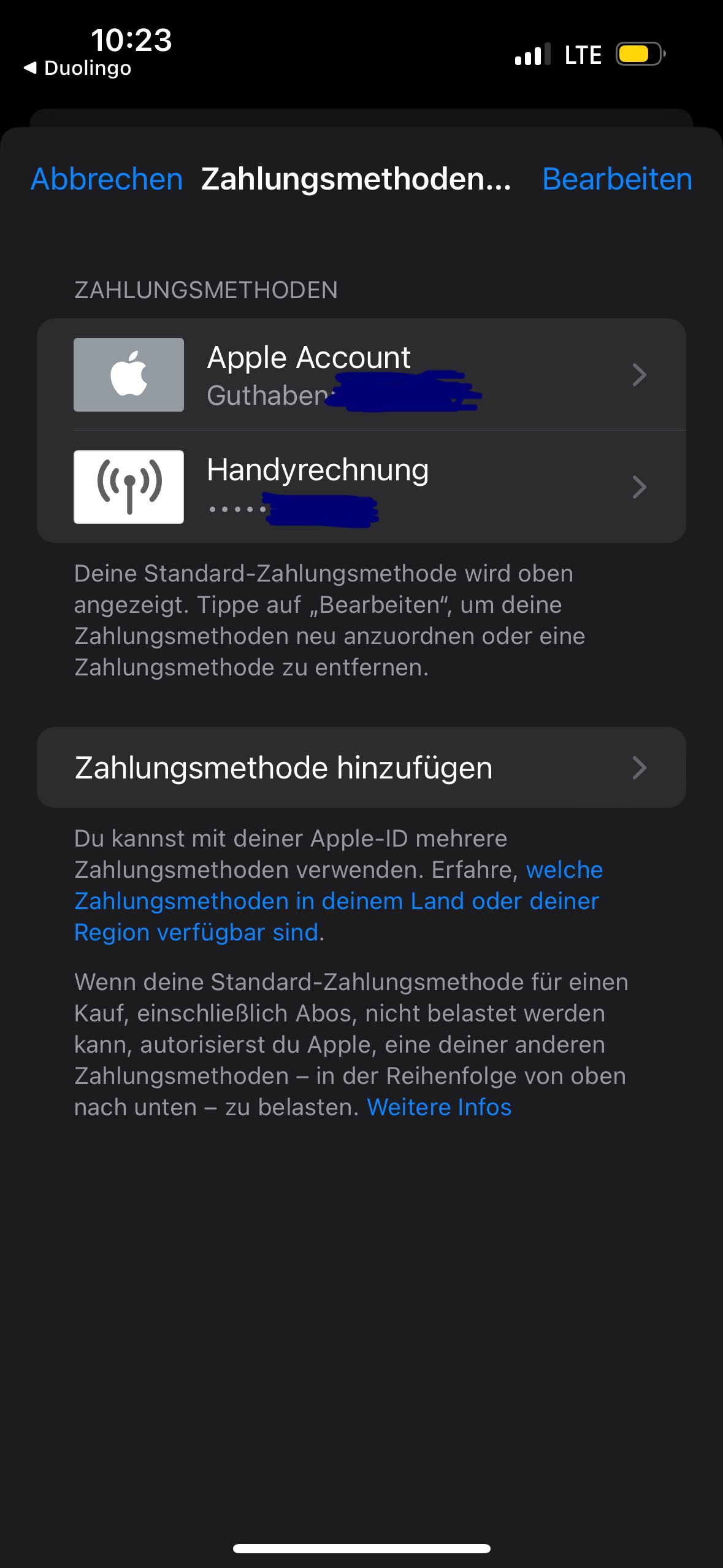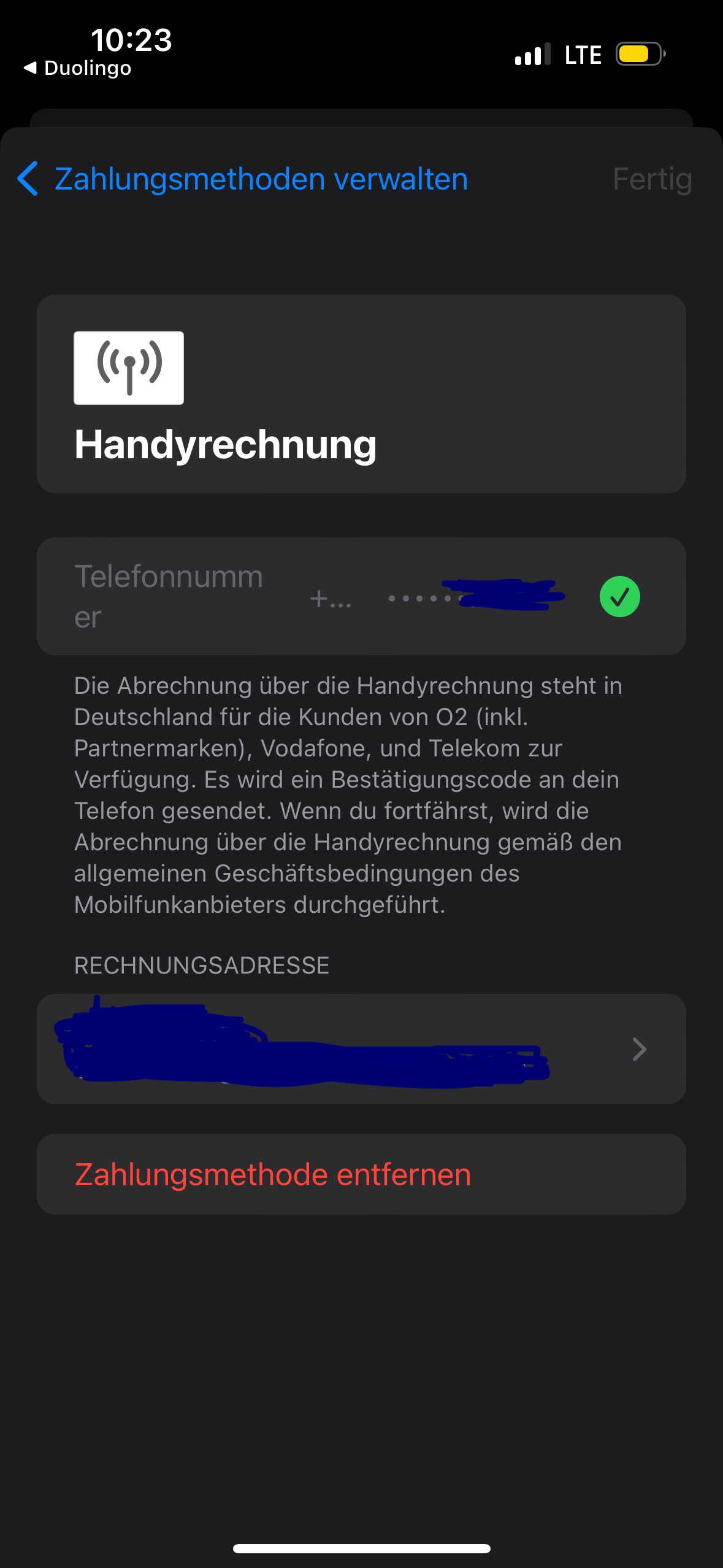 Guten Tag, ich möchte auf meinem IPhone 15 Duolingo Premium nutzen und möchte als Zahlungsmethode die Handyrechnung nutzen. Ich habe bei Einstellungen -> Name -> Zahlung & Versand meine Handyrechnung als Zahlungsmethode hinterlegt, die Nummer habe ich auch überprüft und die stimmt. Wenn ich auf Fertig klicke (beim Einrichten der Zahlungsmethode) bekomme ich eine SMS von Apple mit einem Bestätigungscode um meine Handyrechnung als Zahlungsmethode zu bestätigen. Jetzt frage ich mich wo ich diesen Bestätigungscode eingeben muss. Weil anscheinend funktioniert meine Zahlungsmethode nicht, weil bei Duolingo immer ein Fehler kommt.