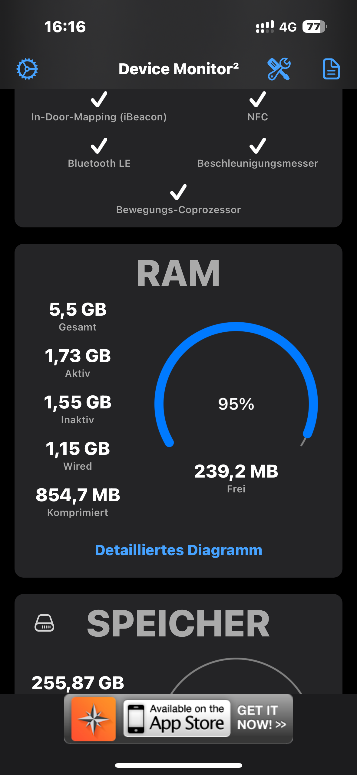 Liebe Apple Community, ich bin in großer Sorge um meinen täglichen Begleiter, das iPhone 14 Pro. Seit einiger Zeit beobachte ich, dass der Arbeitsspeicher des Gerätes bei dauerhaft 95 bis 99 Prozent klettert. Wenn ich komplett alle Apps, außer „Device-Monitor“ (mit dem ich RAM lese & leere) schließe, habe ich trotz dessen immer noch eine Auslastung von 90%. Das ist also der „Ruhezustand“. Es ist nicht oft das eine App abstürzt oder der Browser hängen bleibt aber es kommt trotzdem selten mal vor.