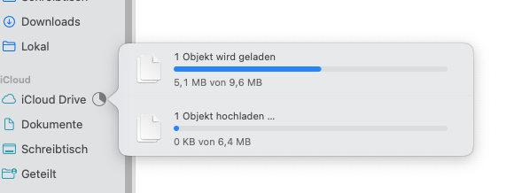 Ich hege den Verdacht, dass das was mit iCloud zu tun haben könnte? Mein iCloud Drive hat einen Viertelmond und zeigt mir an, dass eine Datei hochgeladen wird und eine andere herunter. Allerdings tut sich da überhaupt nichts.