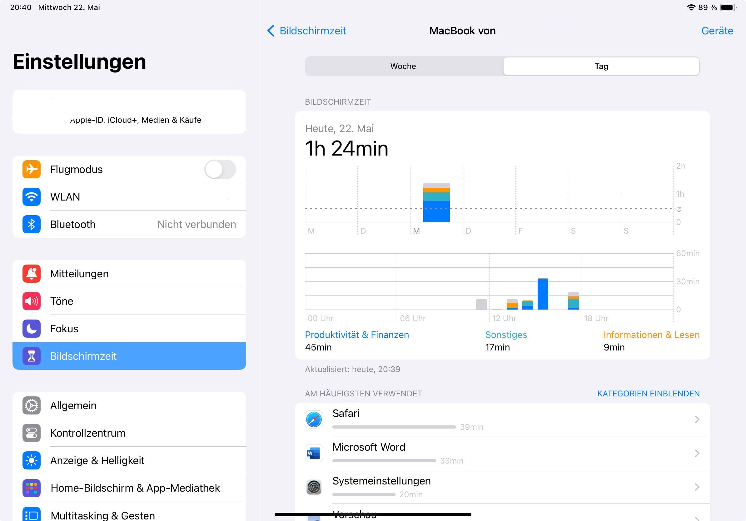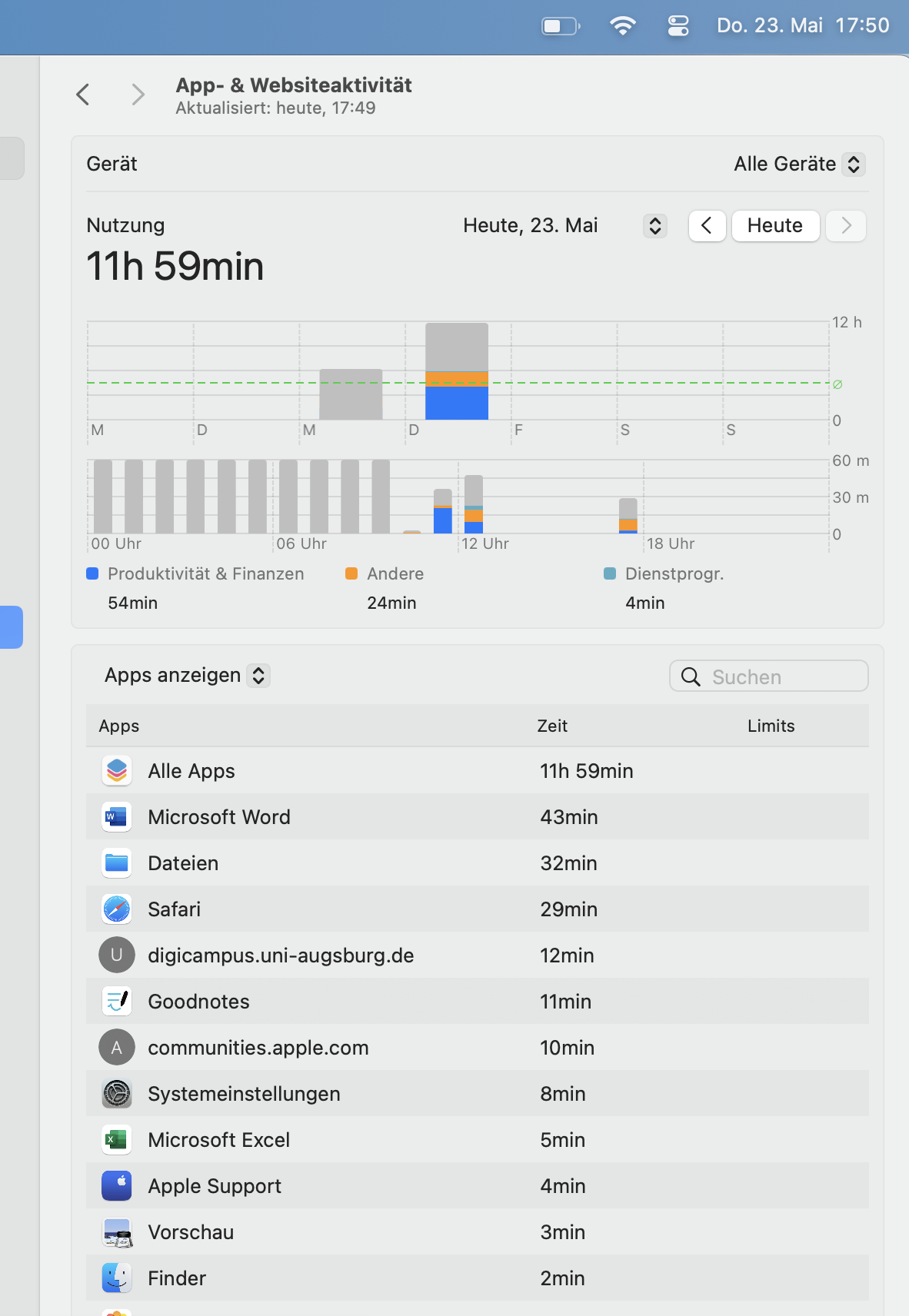 Die einzelnen Apps und Webseiten zusammenaddiert ergeben niemals 24 Stunden und ich kann leider nicht einsehen, was genau die lange Bildschirmzeit verursacht. Die Zeiten meiner Apps/Websites sind alle etwa ein oder zwei Stunden - nur hinter "alle Apps" steht 24 Stunden. Die Zeit wird also keiner App und auch keiner Kategorie zugeordnet.