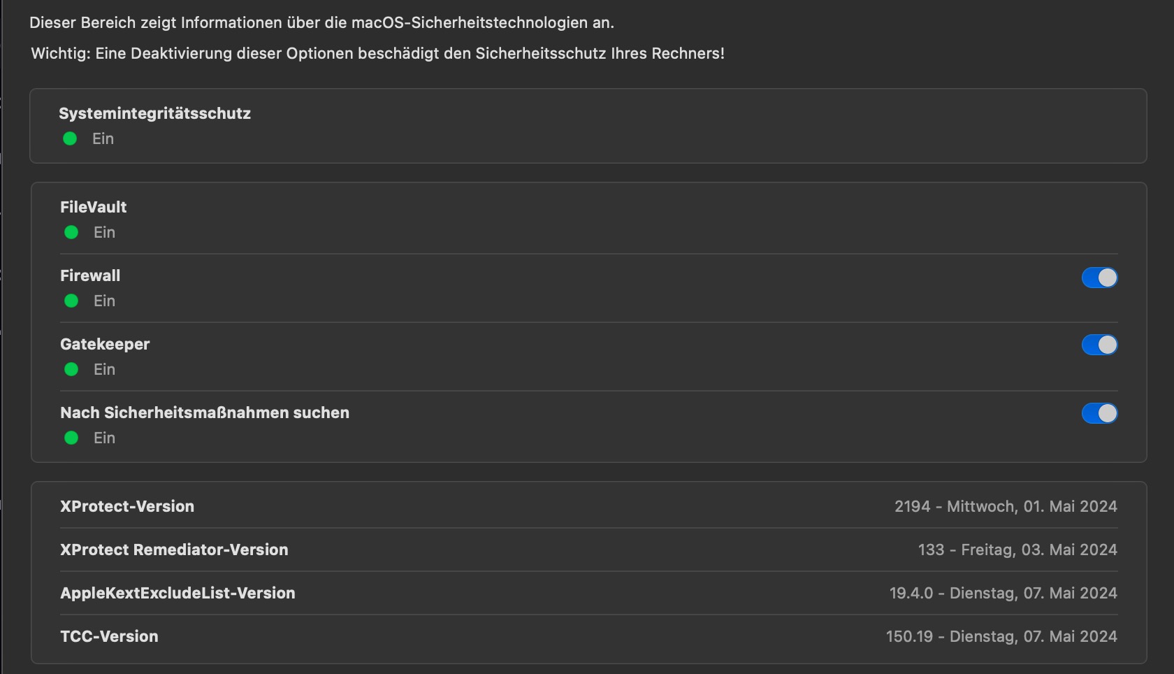 und doch noch: Apple hat ein sehr gutes Sicherheitssystem .- die Virensoftware untergräbt das - lesen tut man da natürlich viel: software will halt auch verkauft werden. Bei guten Tests heißt es - die und jene software ist gut - und am Ende dann klein gedruckt: für einen mac oder gar iphone überflüssig. - und selbst für mein windows notebook mit win 11 pro. nutze ich den defender von microsoft selbst - der ist besser geworden. Früher hatte ich alle durch die Bank: norton - avira - und wie sie alle heißen und immer schön die Vollversion gekauft. Aber nur für windows - für mac os niemals. Nur - wenn einmal drauf auf dem pc - kriegt man die nicht mehr los. Norton und GData haben mir immer noch Jahre später „Einladungen“ geschickt zum update . Herzlich