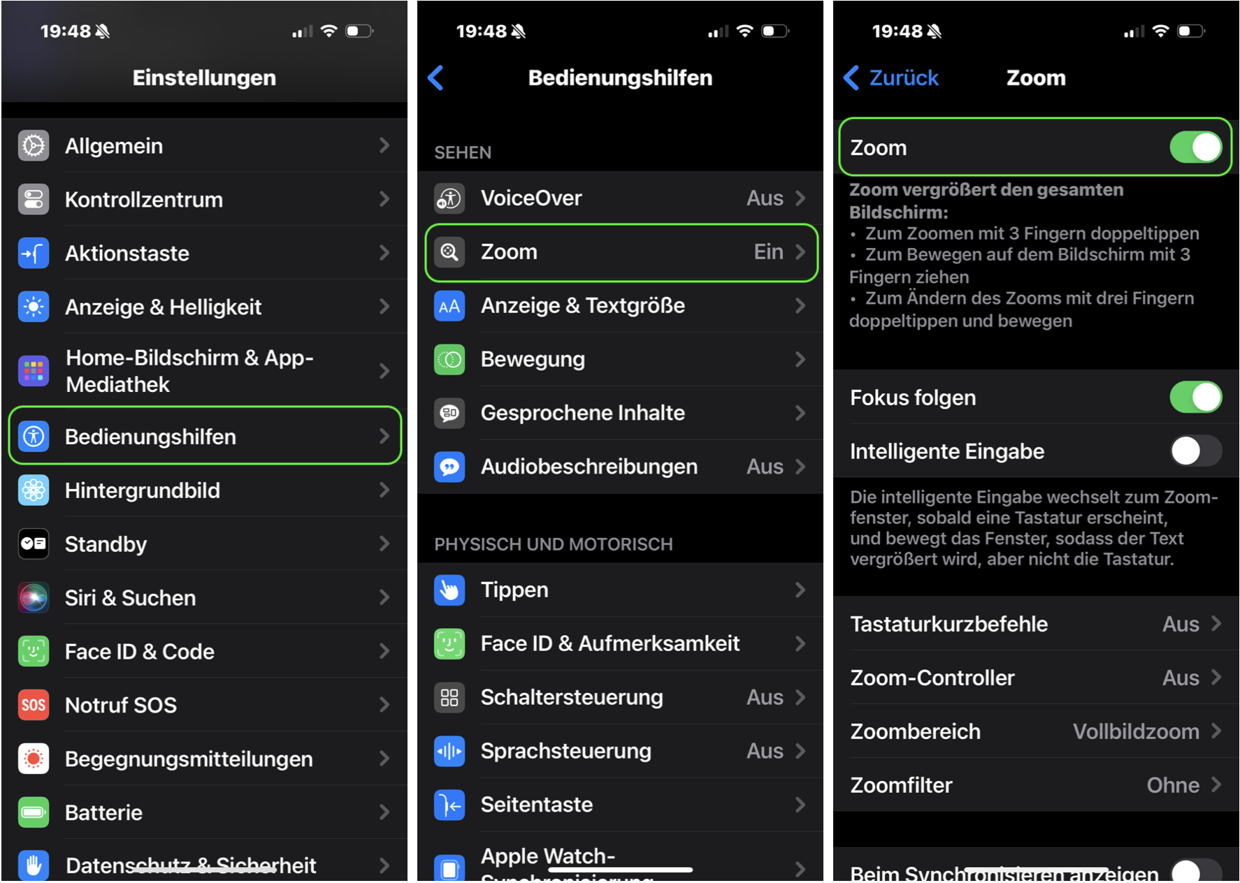 Hallo Barbara, den Trick mit dem Doppeltip hat dir deine Enkelin ja schon verraten. Damit du den Zoom auch künftig nicht versehentlich aktivierst, schau bitte mal nach folgender Einstellung. Gehe zu