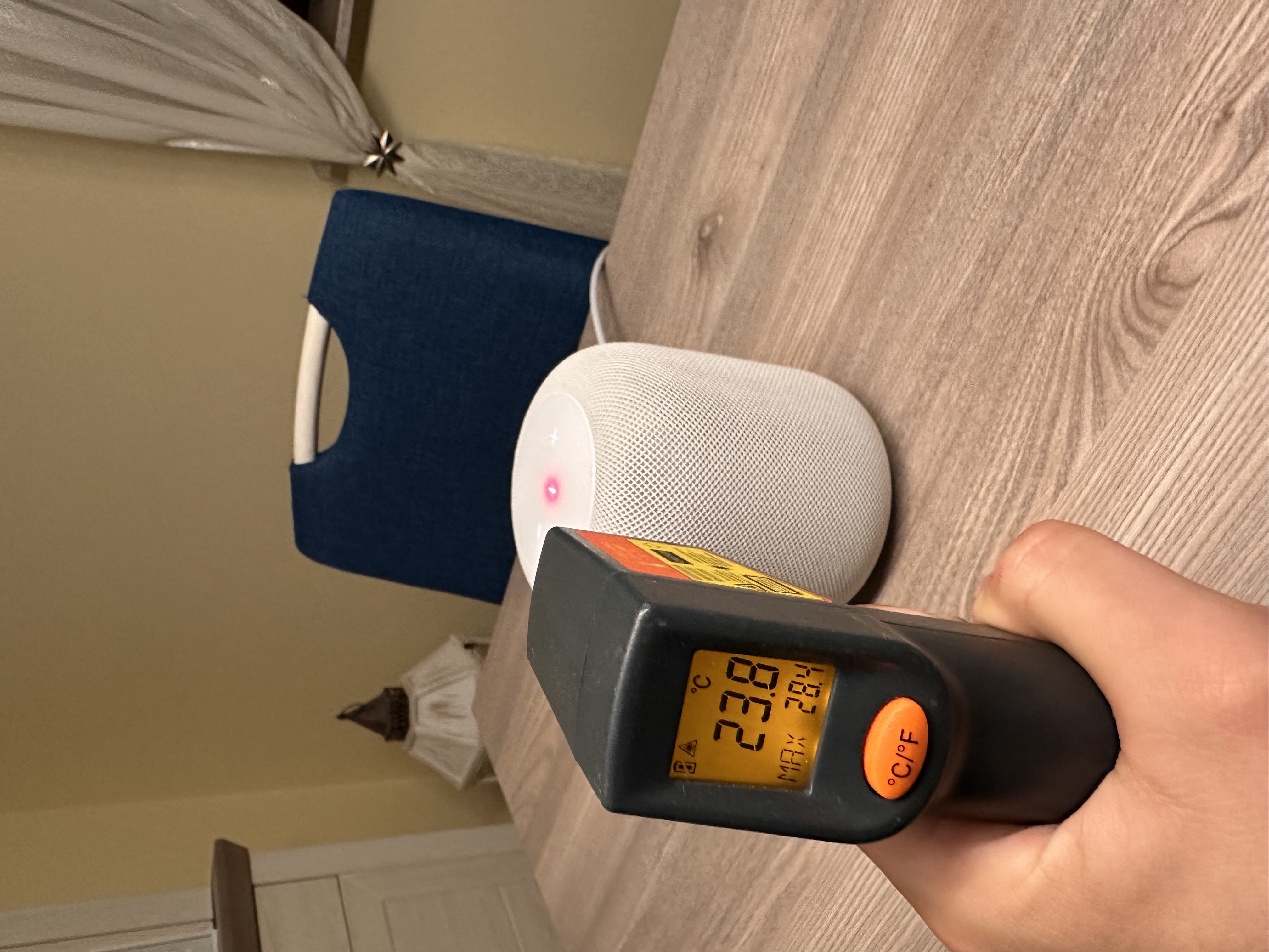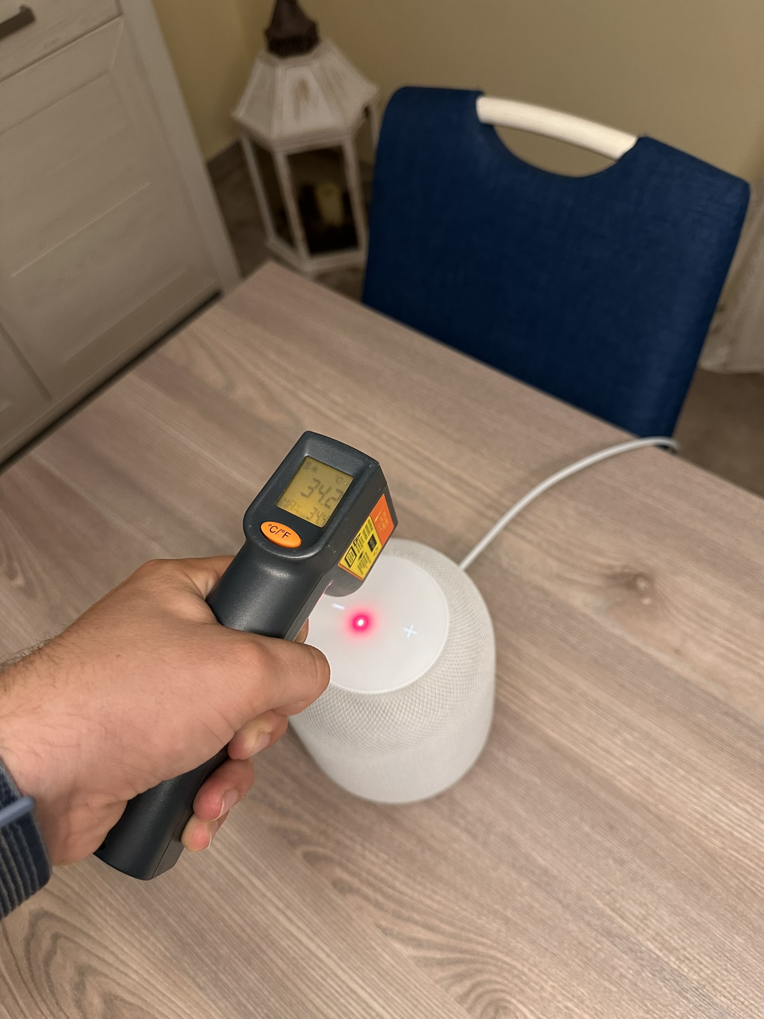 Folgendes ist Phase. Wenn der HomePod nicht genutzt wird erwärmt sich die Glassfläche oben auf dem HomePod, unerklärlicherweise (±40 Grad). Er ist keine aktive Steuerzentrale, er spielt keine Musik, er steht nicht am Fenster, nicht an einer Heizung oder in der Sonne, er macht schlichtweg nichts. Ich weiß, direkt unter dem Display sitzt unser passiv gekühlter Prozessor, die Hitzeentwicklung vom Verstärker wird ja über einen Mittalleiter an der Vorderseite des Gerätes abgegeben. Und ich weiß auch, dass Apple offiziell bei den HomePod Minis und den HomePod 2er darauf hinweist das deren Temperaturmesswerte für die Home App ungenau sein können bei langer Benutzung (aufgrund der Hitzeentwicklung des Gerätes). Aber hier liegt ja keine Nutzung vor.