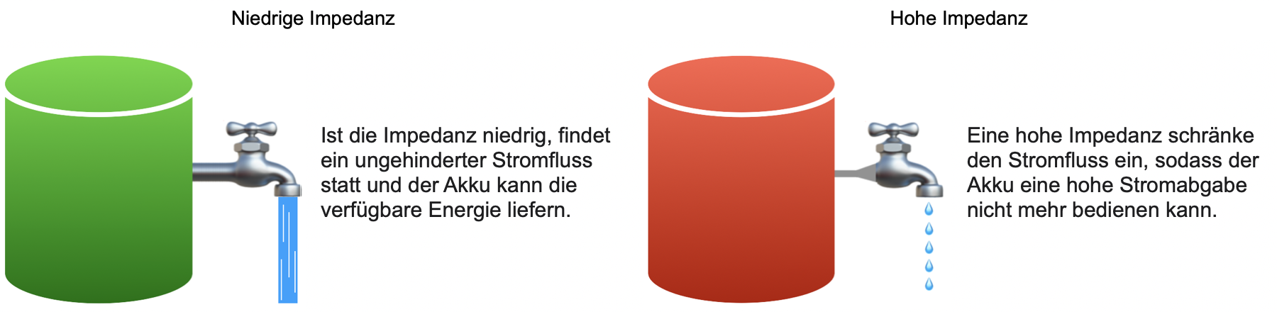 Die Impedanz eines Akkus ist ein wichtiger Faktor, der den Stromfluss und damit die Leistung, Effizienz und Lebensdauer des Akkus beeinflusst. Niedrige Impedanz ist in der Regel wünschenswert, da sie einen geringeren Spannungsabfall, weniger Wärmeentwicklung und eine höhere Effizienz beim Laden und Entladen bedeutet.
