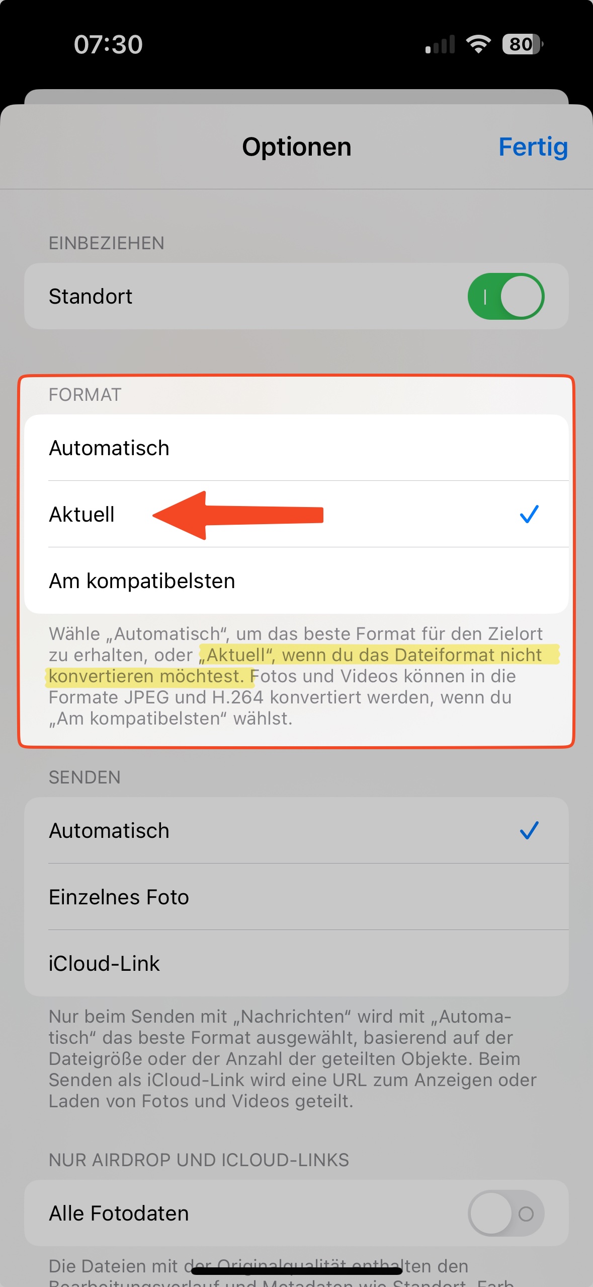 Tippe beim Teilen oben auf "Optionen" und wähle dann das. Format "Aktuell". Das sollten dann das Original sein.